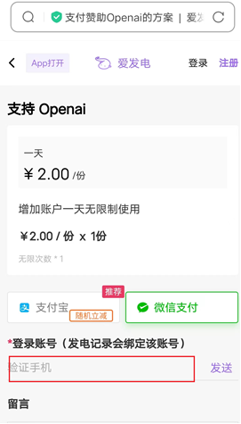 续费流程:系统弹出续费窗口【新用户免费使用1天】,点击“赞助”按钮,app自动跳转至支付页面。