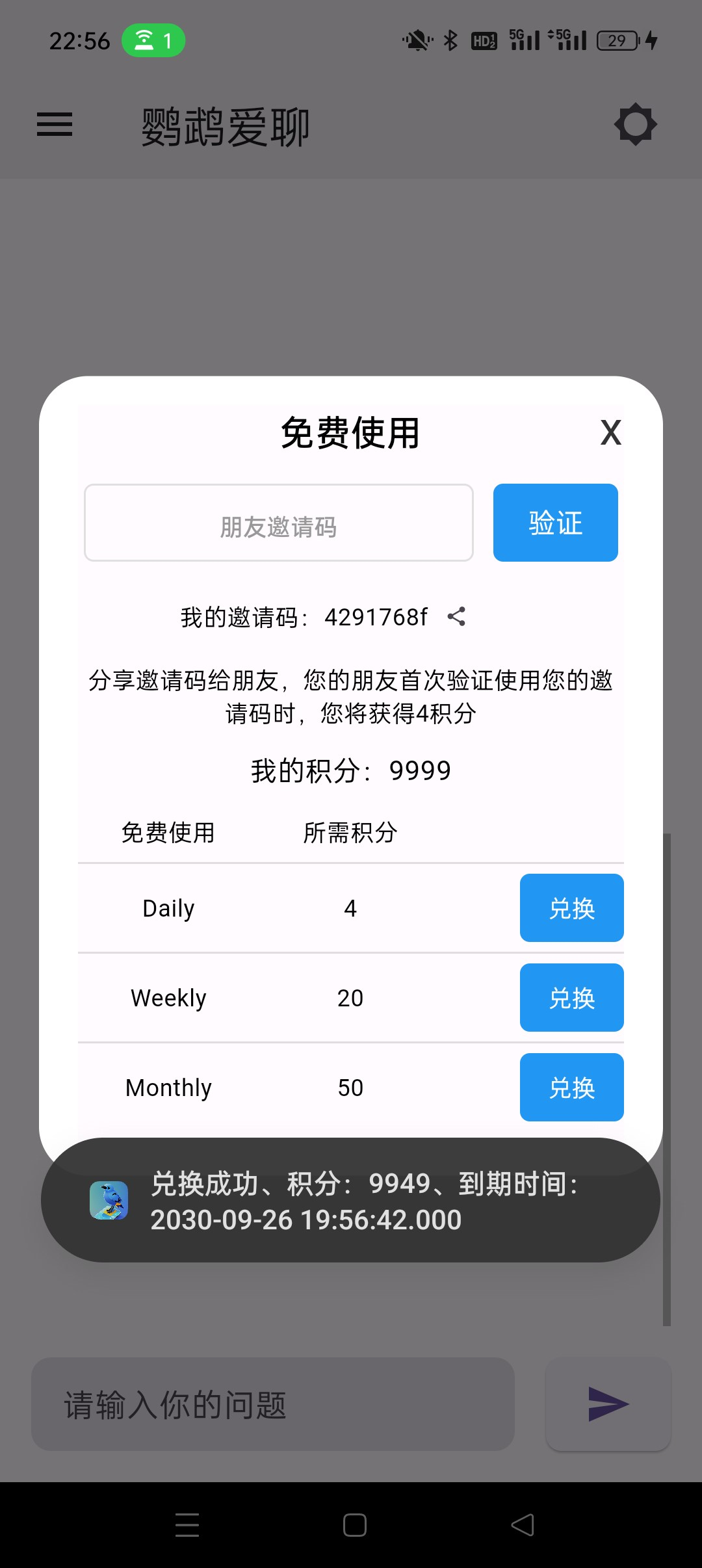 分享内容为:(此处 chatgpt 建议删除)应用下载:http://app.yingwu.lol/parrot.apk 我的邀请码:xxxxxxxx。被推广的用户下载使用时,【输入该 xxxxxxxx 专属邀请码】,分享方将自动获得4分积分。点击兑换即可免续费延长使用时间。复制以上内容至朋友圈,将会获得更多积分。